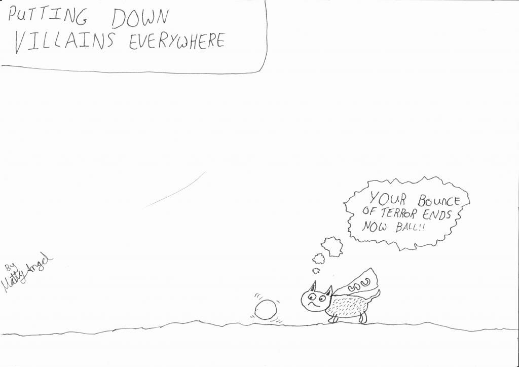 AND THIRD! AND FINAL!!!! SUPER CAT HAS ONCE AGAIN RETURNED!!! This time to put down the Villain… Bouncy Ball hehe, my kitty has been very confused by the bouncy ball I have, she isn’t sure if to chase it, be afraid of it…